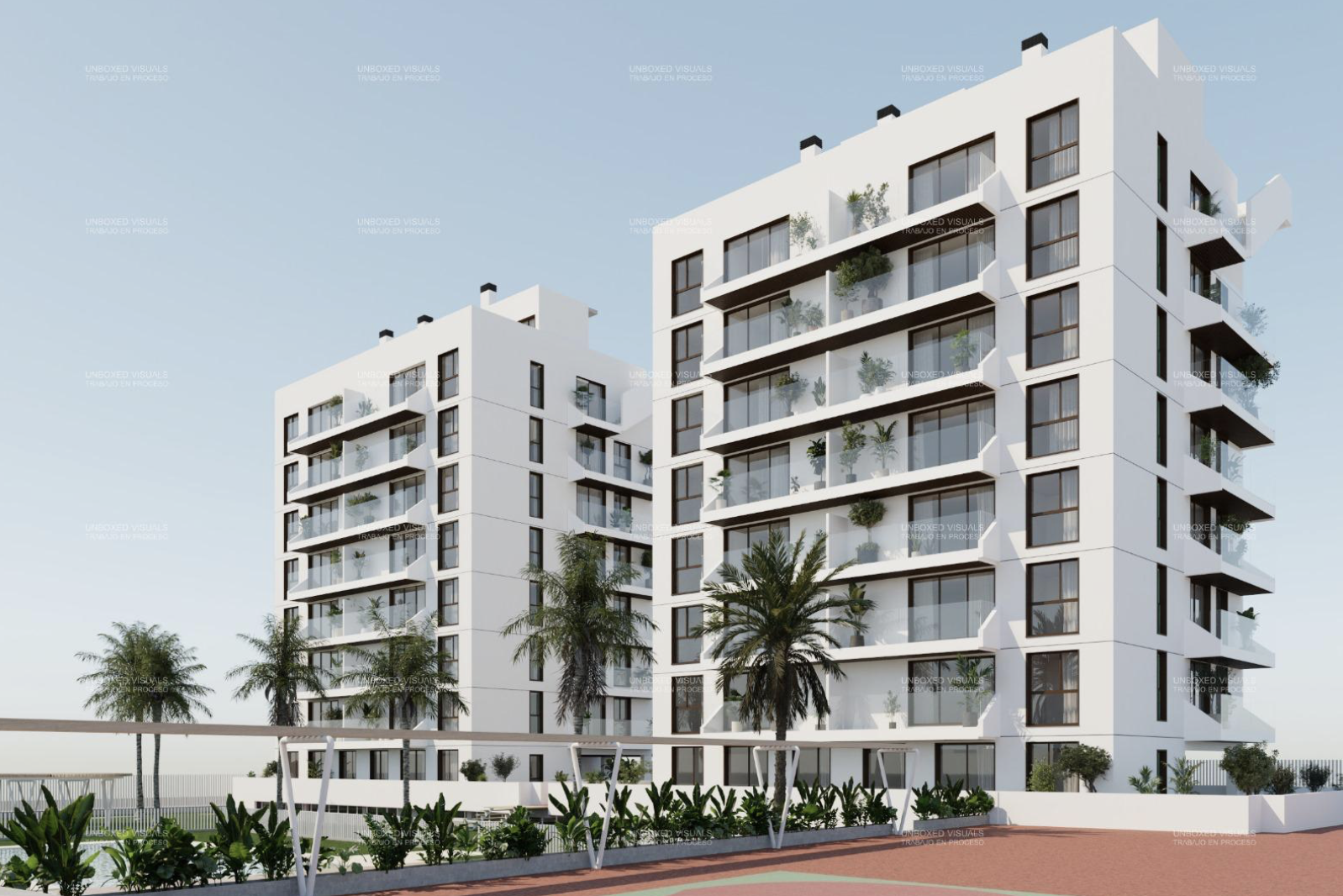 De buitenruimtes van dit residentieel complex zijn ontworpen voor ontspanning en optimaal comfort, met ruime terrassen waar bewoners het mediterrane klimaat het hele jaar door kunnen beleven. De terrassen zijn perfect voor buiten dineren, ontspannen of genieten van het natuurlijke licht en de milde temperaturen van de regio.